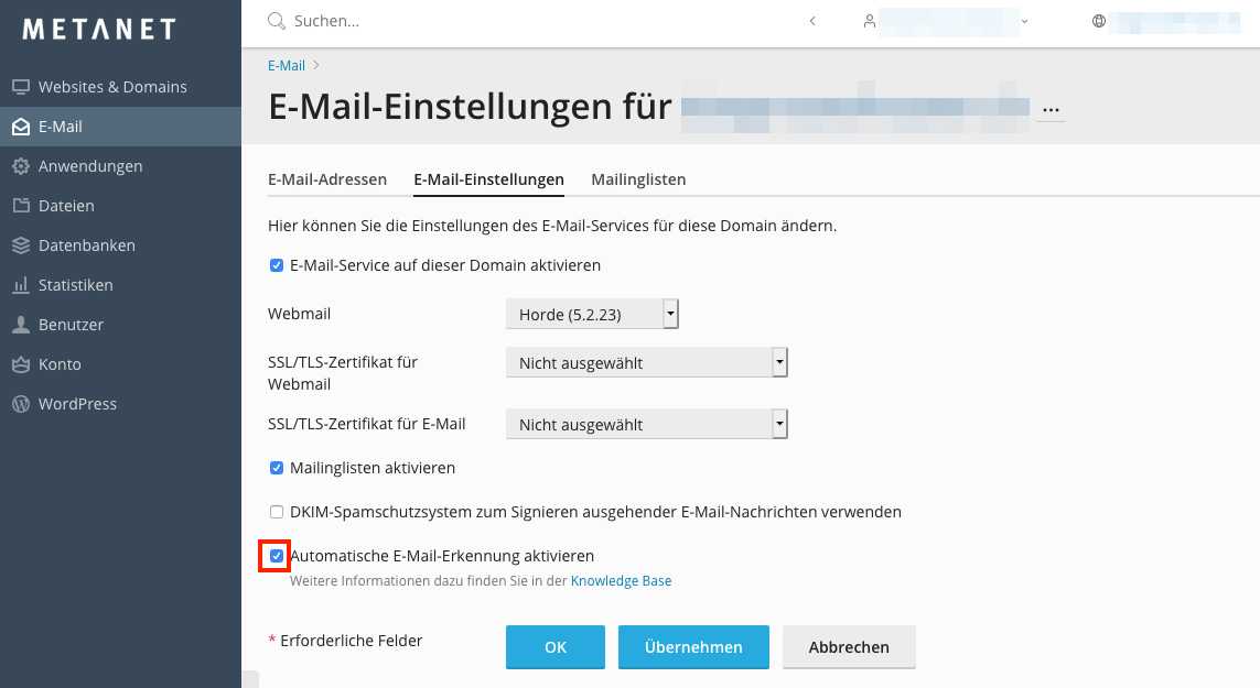 2. Setzen Sie nun den Haken bei Automatische E-Mail-Erkennung aktivieren.