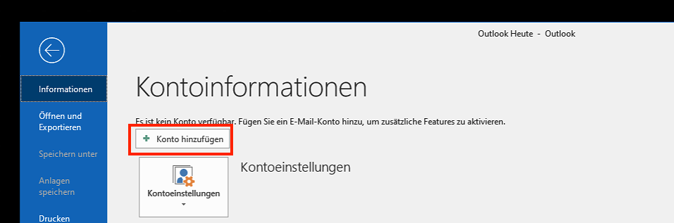 1. In Outlook können Sie unter Datei → Informationen auf Konto hinzufügen klicken.