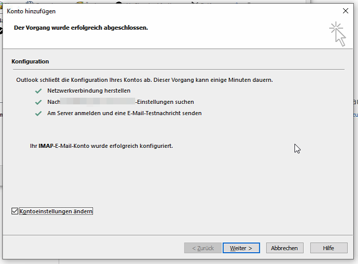 3. Die Einrichtung ist nun abgeschlossen. Wir bitten Sie dennoch, die erweiterten Einstellungen vorzunehmen um SSL mit den jeweiligen Ports 993 und 465 zu aktivieren.