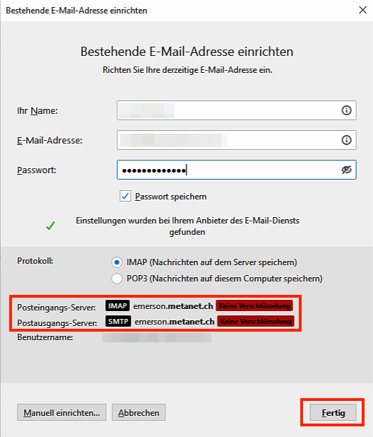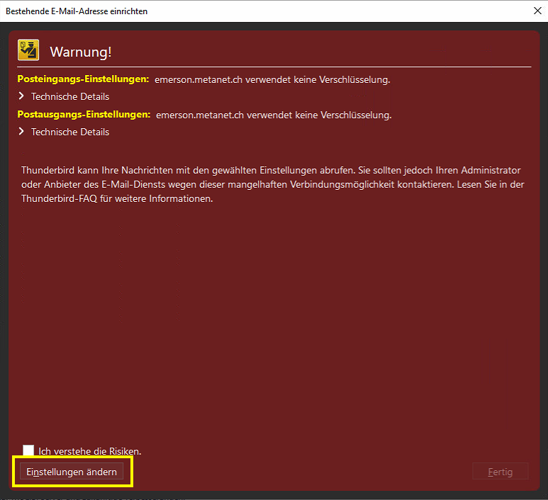 Thunderbird erkennt nun automatisch den Server und weist daraufhin, dass keine Verschlüsselung eingerichtet wurde. Klicken Sie auf Fertig.