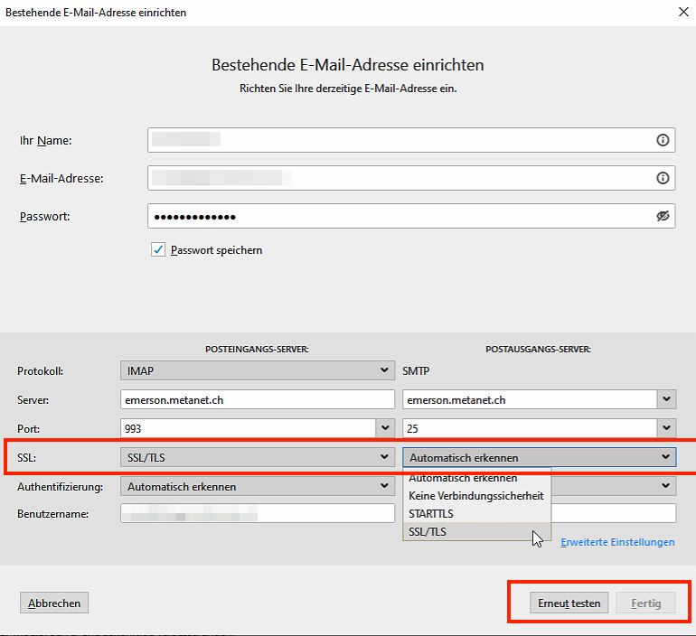 Stellen Sie bei SSL das Feld von Automatisch erkennen auf SSL/TLS. Die Ports werden vom Programm automatisch angepasst bei Umstellung dieser Option. Danach klicken Sie auf Erneut testen und anschliessend auf Fertig.