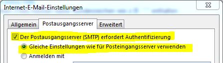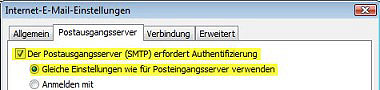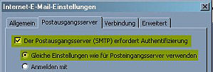- m Registerblatt Postausgangsserver wählen Sie Der Postausgangsserver (SMTP) erfordert Authentifizierung.