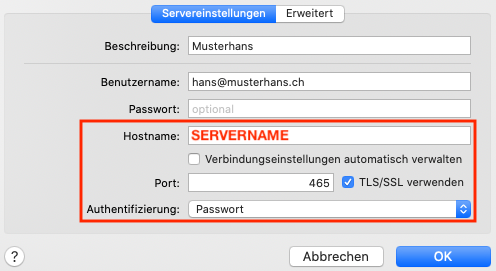- Aktivieren Sie SSL und geben den Servernamen sowie bei der Beschreibung Ihre E-Mail-Adresse ein.