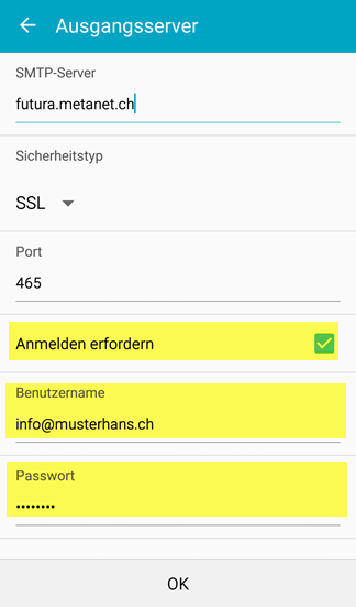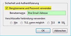 - Setzen Sie den Haken bei Anmelden erfordern und geben Sie als Benutzername Ihre E-Mail-Adresse und unter Kennwort Ihr persönliches Passwort ein: