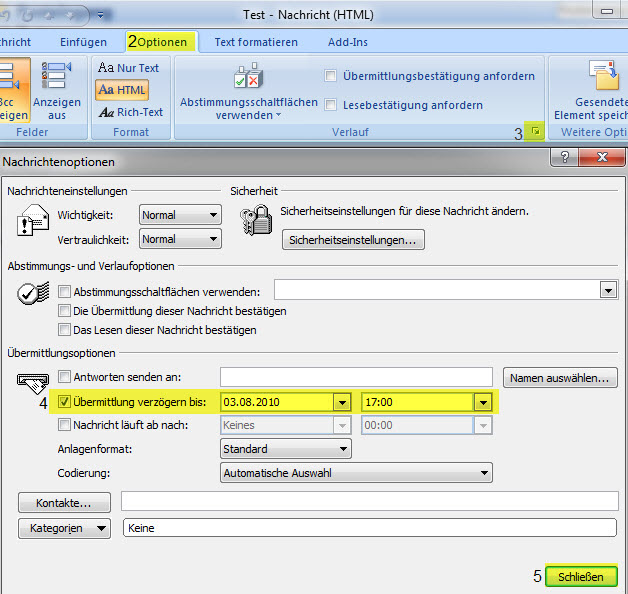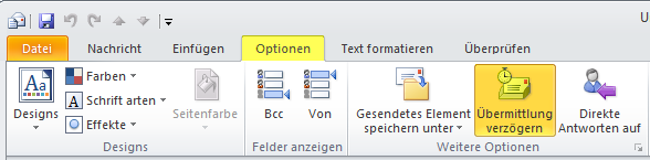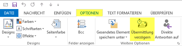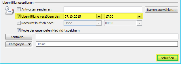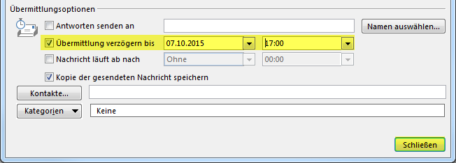 4. Aktivieren Sie die Option Übermittlung verzögern bis und tragen Sie das gewünschte Datum sowie die Uhrzeit ein