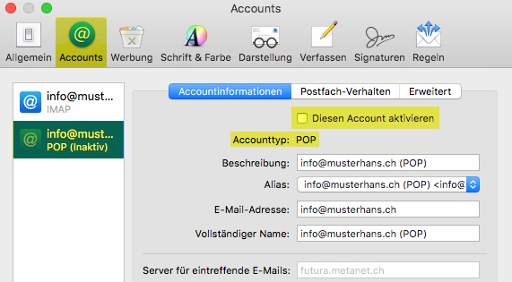 Sobald alle Nachrichten migriert wurden, kann der POP Account deaktiviert werden. Entfernen Sie dazu unter Mail → Einstellungen → Accountinformationen den Haken bei Diesem Account aktivieren.