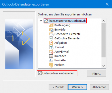 Im nächsten Schritt sehen Sie Ihre gesamte Ordnerstruktur. Um alles zu exportieren, klicken Sie zuoberst in der Hierarchie auf den Kontonamen. Stellen Sie sicher, dass die Option Unterordner einbeziehen ausgewählt ist.