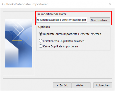 Öffnen Sie den Import/Export-Assistent erneut über Datei → Öffnen und exportieren → Importieren/Exportieren.