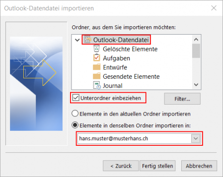 Die Datei wird nun geladen. Im nächsten Schritt können Sie den zu importierenden Ordner auswählen. Wählen Sie hier direkt Outlook-Datendatei aus und stellen Sie sicher, dass die Option Unterordner einbeziehen ausgewählt ist. Über das Dropdown-Feld Elemente in denselben Ordner importieren in: stellen Sie sicher, dass die E-Mails in das korrekte Konto importiert werden, falls bereits mehrere Konten im Outlook eingerichtet sind.