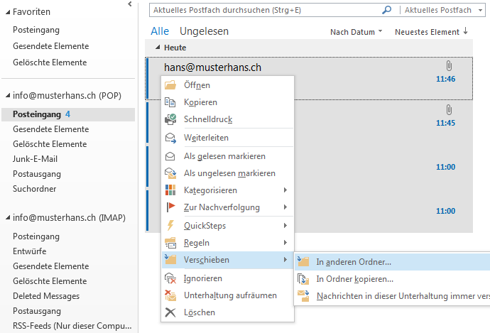 Verschieben Sie nun alle E-Mails des Posteingangs in den Ordner Posteingang unter dem IMAP Konto. Alle E-Mails markieren → Rechtsklick → Verschieben → In anderen Ordner.