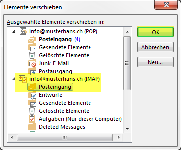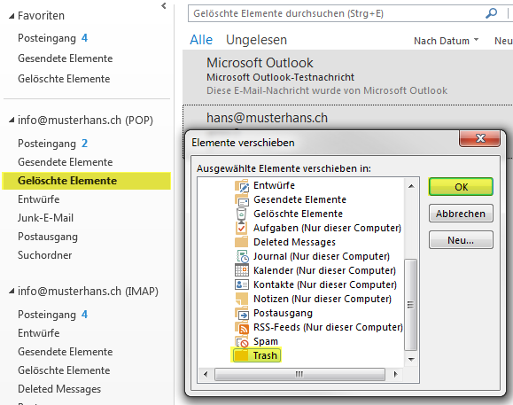 Verschieben Sie alle E-Mails unter dem POP3 Ordner, gelöschte Elemente in den IMAP Ordner Trash.