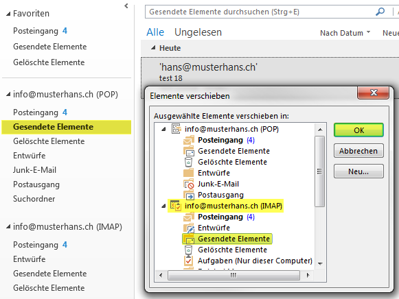 Verschieben Sie alle E-Mails unter dem POP3 Ordner Gesendete Elemente in den IMAP Ordner sent-mail.