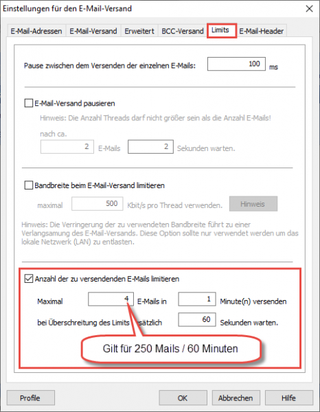 Achten Sie auf die Einhaltung der von uns definierten Limits: Falls Sie eine grössere Verteilerliste haben und diese Limite für Sie eine Unbequemlichkeit darstellt, empfehlen wir Ihnen unsere Option SMTP Relay. |