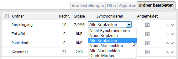 Mit dem Synchronisations-Modus (sync modes) kann bestimmt werden, wie die Webmailer-Ordner mit den Ordner auf dem Mailserver synchronisiert werden. Die Einstellungen finden Sie unter: