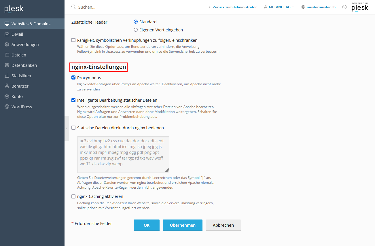 Um so zum Beispiel auszuschließen, dass Apache jpg- und gif-Dateien bereitstellt, schalten Sie die Option Statische Dateien direkt durch nginx bedienen ein und geben die Dateierweiterungen in etwa wie folgt an: