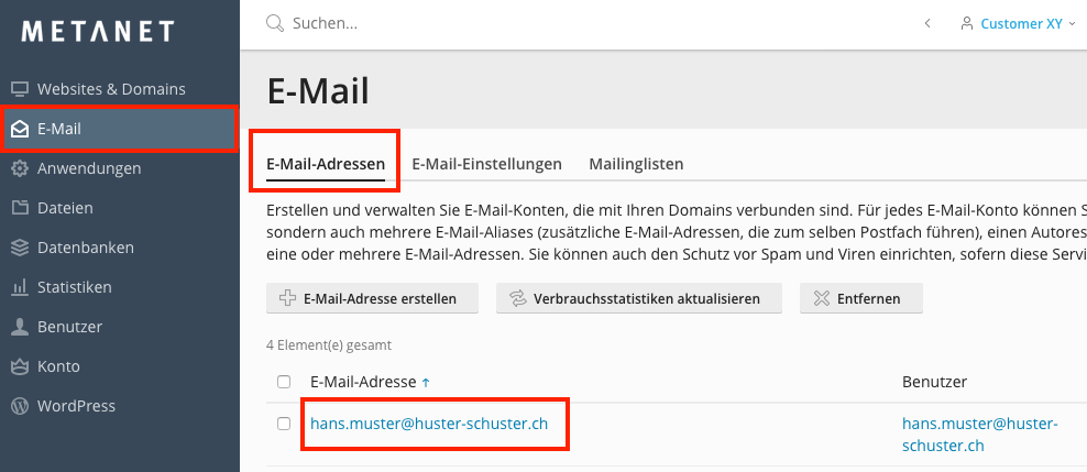 Klicken Sie oben auf die Registerkarte E-Mail. Klicken Sie die entsprechende E-Mail-Adresse an.