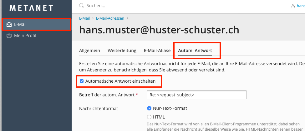 Wechseln Sie zum Reiter „Automatische Antwort“ und aktivieren Sie Automatische Antwort einschalten. Gestalten Sie Ihren Autoresponder nach Wunsch.