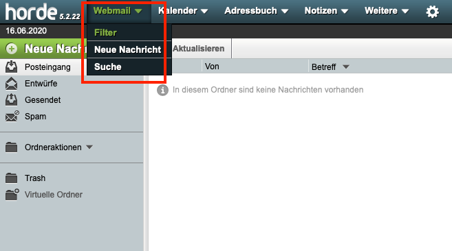 Loggen Sie sich im Webmail Horde ein und wählen Sie Webmail → Filter.