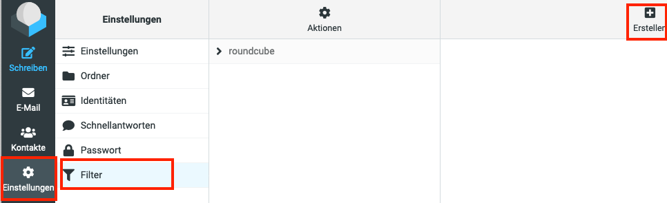Loggen Sie sich im Webmail roundcube ein und wählen Sie Einstellungen → Filter und klicken dann auf Erstellen.