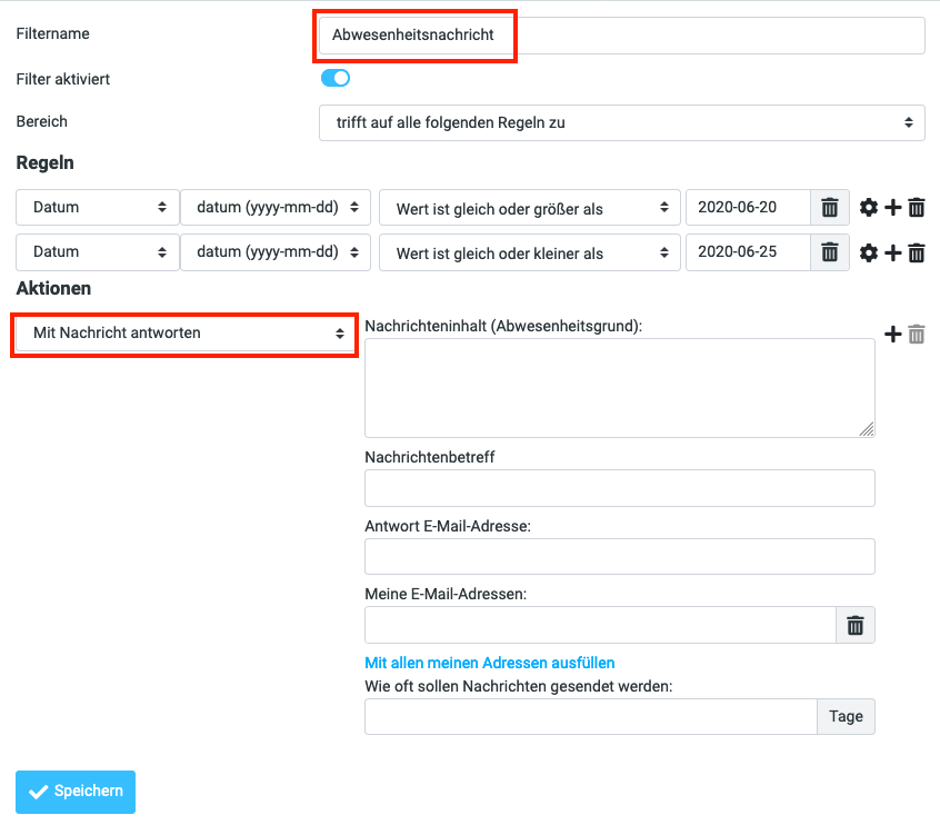 Vergeben Sie einen Filternamen und legen Sie mithilfe der Regeln den Zeitraum fest. Bei Aktionen wählen Sie Mit Nachrichten antworten und gestalten Sie die Autoantwort wunschgemäß, danach mit Speichern abschließen.