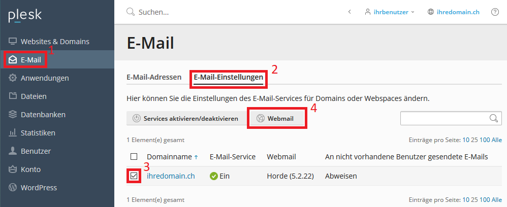 Klicken Sie auf den Reiter E-Mail und danach auf E-Mail-Einstellungen. Der Haken neben der Domain muss gesetzt werden und anschliessend klicken Sie auf Webmail.