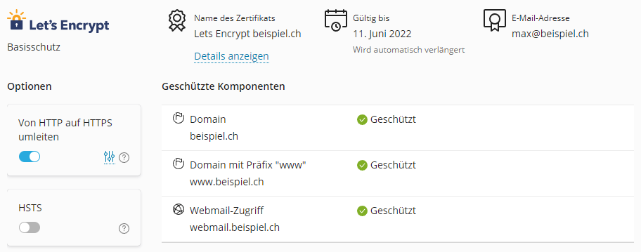 Let's Encrypt stellt auf einfache Weise kostenlose Zertifikate (FreeSSL) für die Verschlüsselung von Web-Verkehr zur Verfügung. Auf unserer Hosting-Umgebung Plesk bieten wir eine benutzerfreundliche Implementation an. Die Absicherung von Webmail ist möglich.