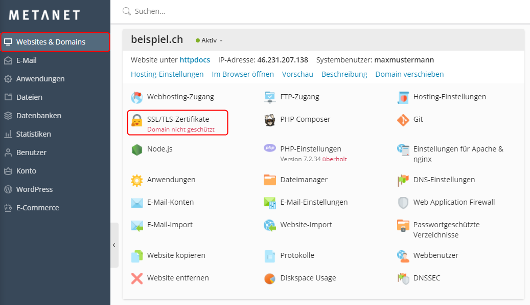 Wählen Sie unter Websites & Domains den Menüpunkt SSL/TLS-Zertifikate an.
