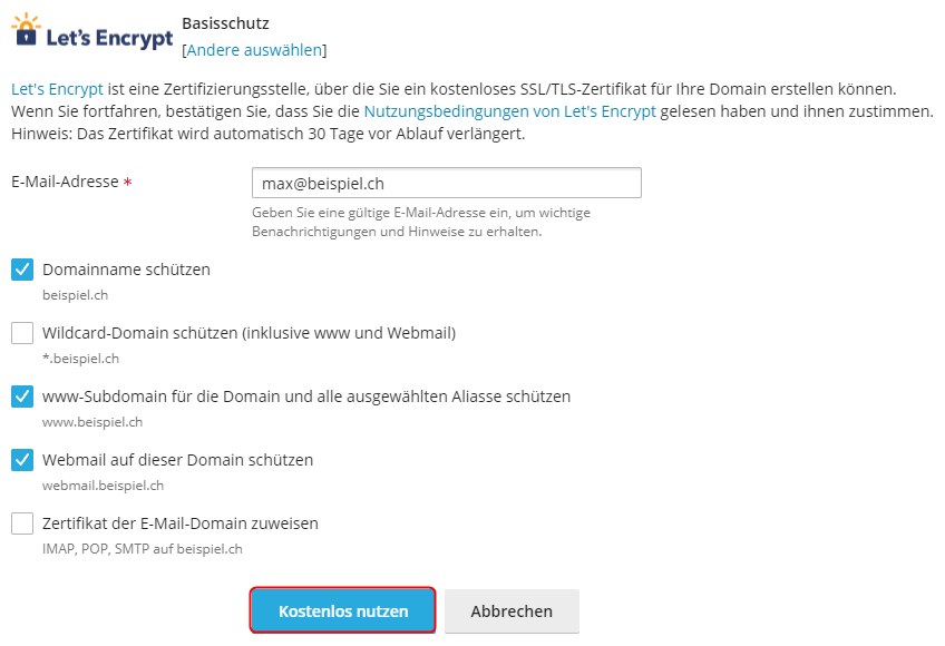 Klicken Sie auf Kostenlos nutzen und warten Sie anschliessend die Ausstellung des Zertifikats ab.