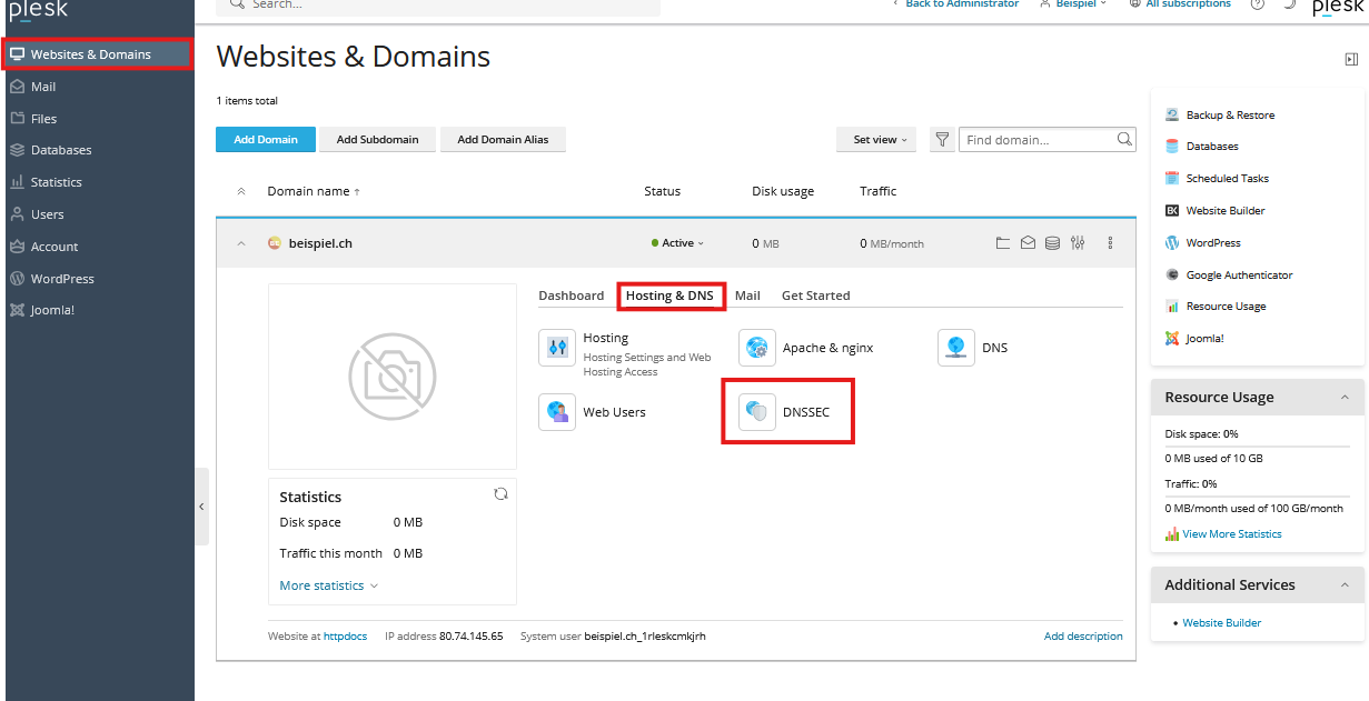 Die DNSSEC-Verwaltung ist in Plesk unter „Websites & Domains“ → „DNSSEC“ zugänglich: