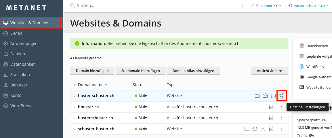 2. Wählen Sie die Registerkarte Websites & Domains. Die Hosting-Einstellungen sind hier über einen Button direkt zugänglich.