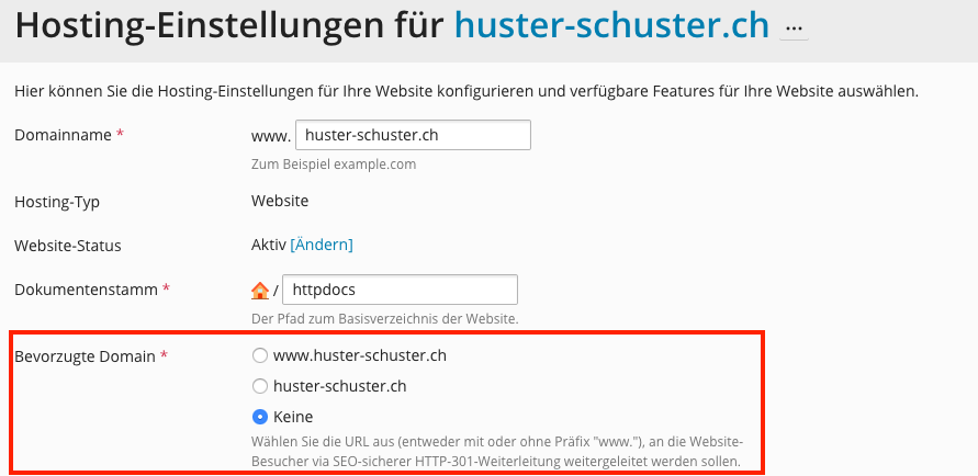 Keine: Diese Einstellung wird unsererseits empfohlen und sollte auf Keine belassen werden, um Fehlerquellen zu vermeiden und wenn keine bevorzugte Vorgehensweise festgelegt ist. Dies gilt auch dann, wenn die Weiterleitung zu www oder ohne www bereits im CMS oder in einer .htaccess-Datei geregelt wird.