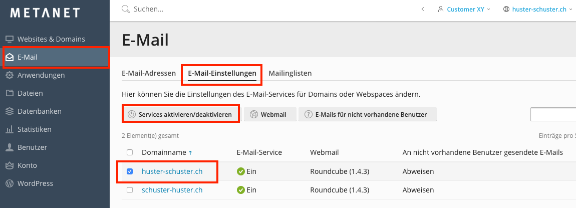 Klicken Sie unter der gewünschten Domain nun auf E-Mail Einstellungen wählen Sie die betreffende Domain aus und klicken Sie anschliessend auf Services aktivieren/deaktivieren.