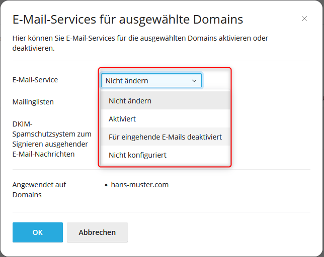 Sie können über das Drop-Down Menü den E-Mail Dienst deaktivieren bzw. aktivieren. Folgende Optionen stehen zur Verfügung:
