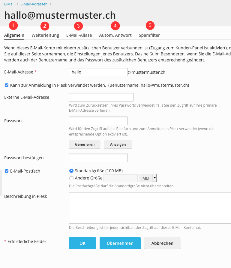 Das Passwort für die E-Mail-Adresse kann hier geändert und die Postfachgrösse
