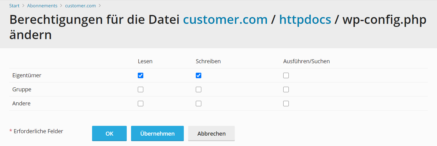 Konfigurationsdateien sind nach der Rechtevergabe nicht mehr global beschreibbar, aber immer noch global lesbar.