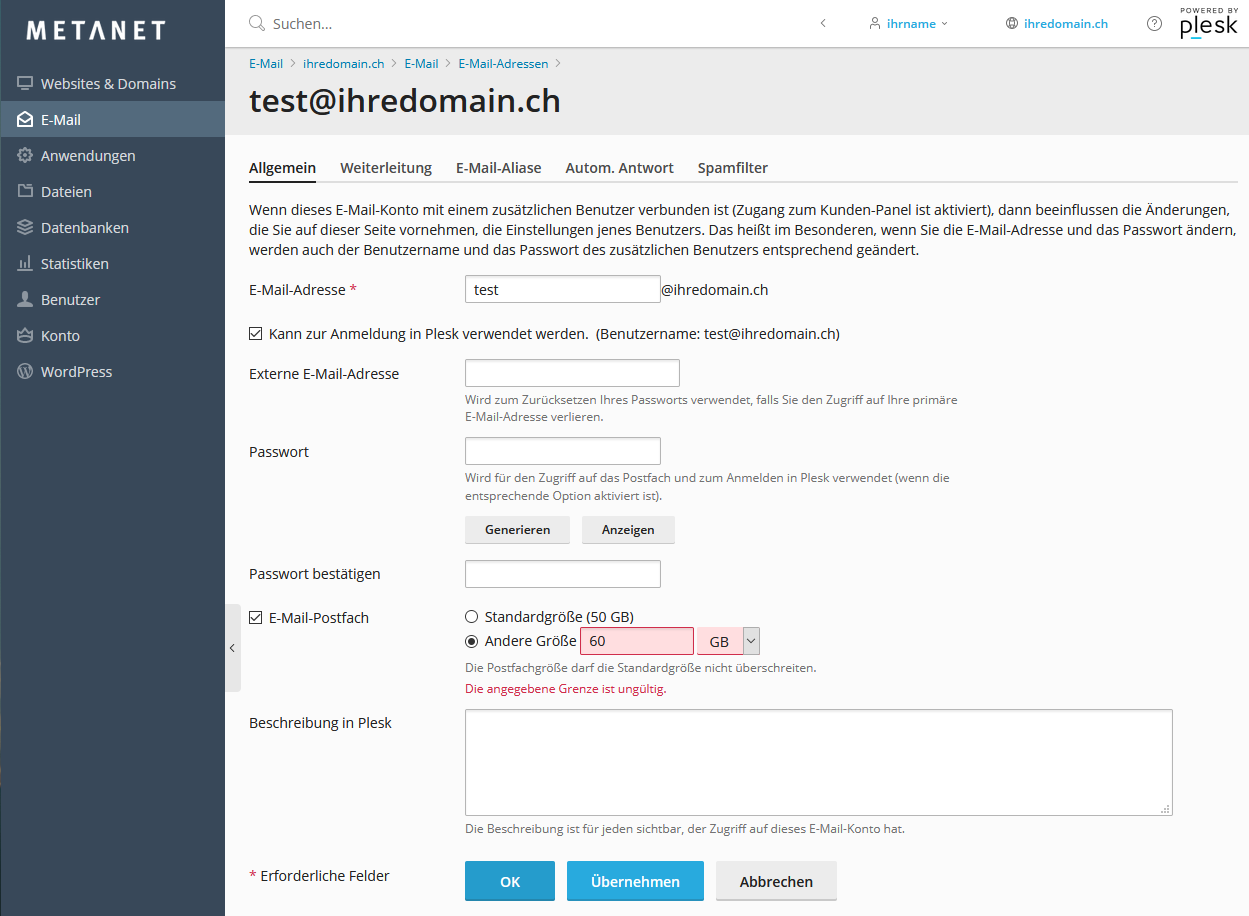 Die Mailbox-Quota bestimmt den Speicherplatz einer Mailbox. Wird sie überschritten, sind keine E-Mails mehr möglich. Die Quota kann nicht über den Domain-Standard erhöht werden. Bei Bedarf einer höheren Quota sollte METAhost kontaktiert werden. Reseller können die Quota über ihr Service-Paket selbst festlegen.