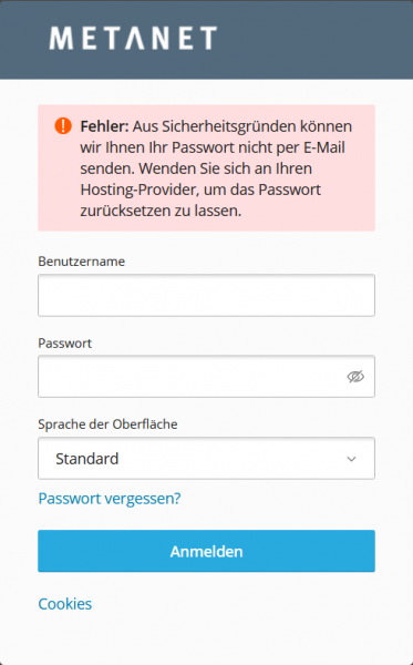 Durch dieses Setup kann das Passwort für den Reseller Fritz Müller nicht versendet werden. Um Ihr Passwort zurückzusetzen, melden Sie sich über unser Support-Formular. |