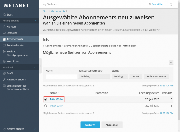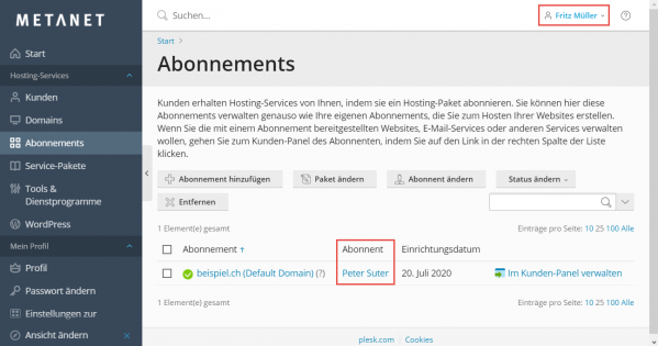 Der Reseller Fritz Müller erfasst die Domain beispiel.ch auf Seinem Hosting und weist das Abonnement dem Kunden Peter Suter zu.