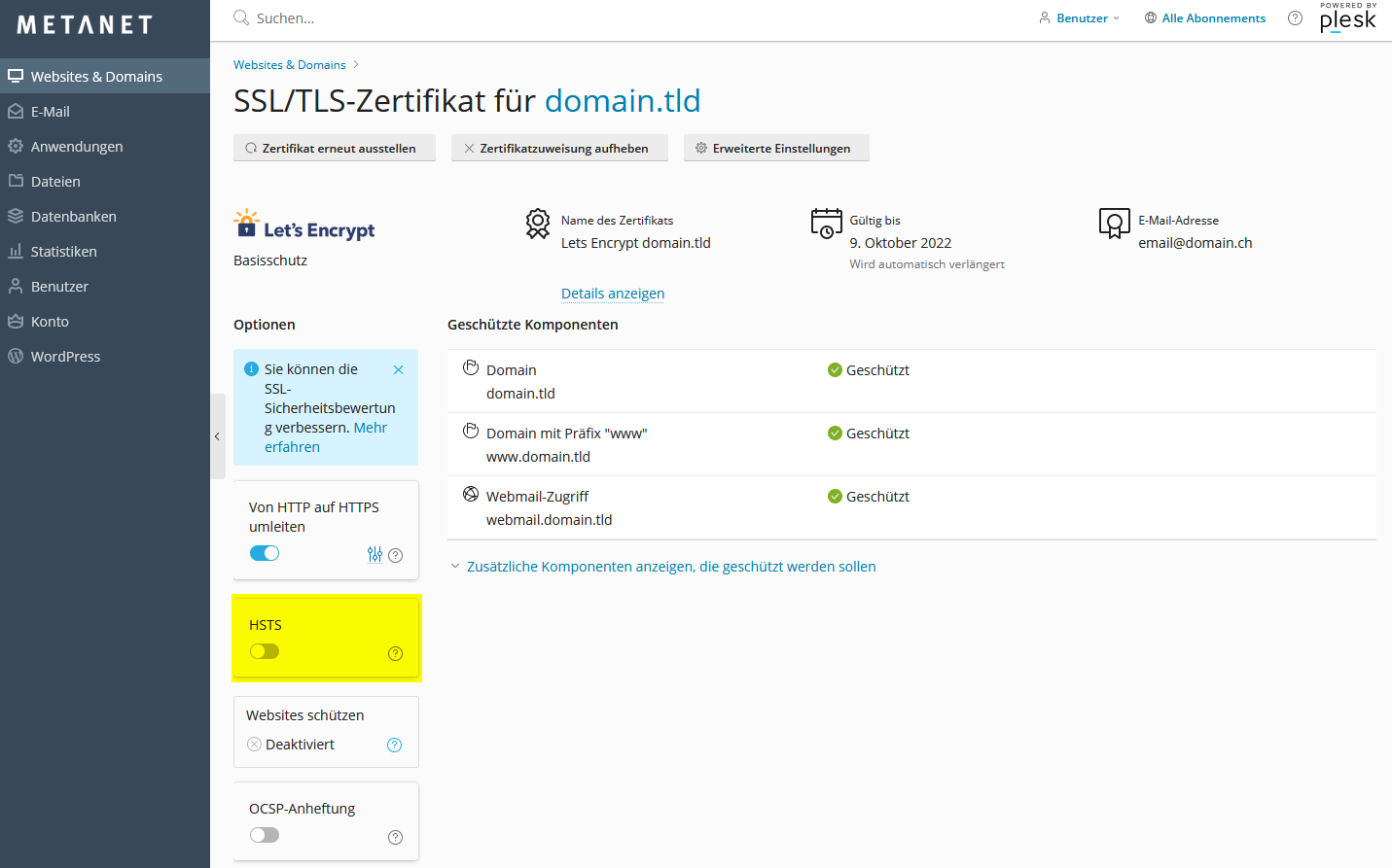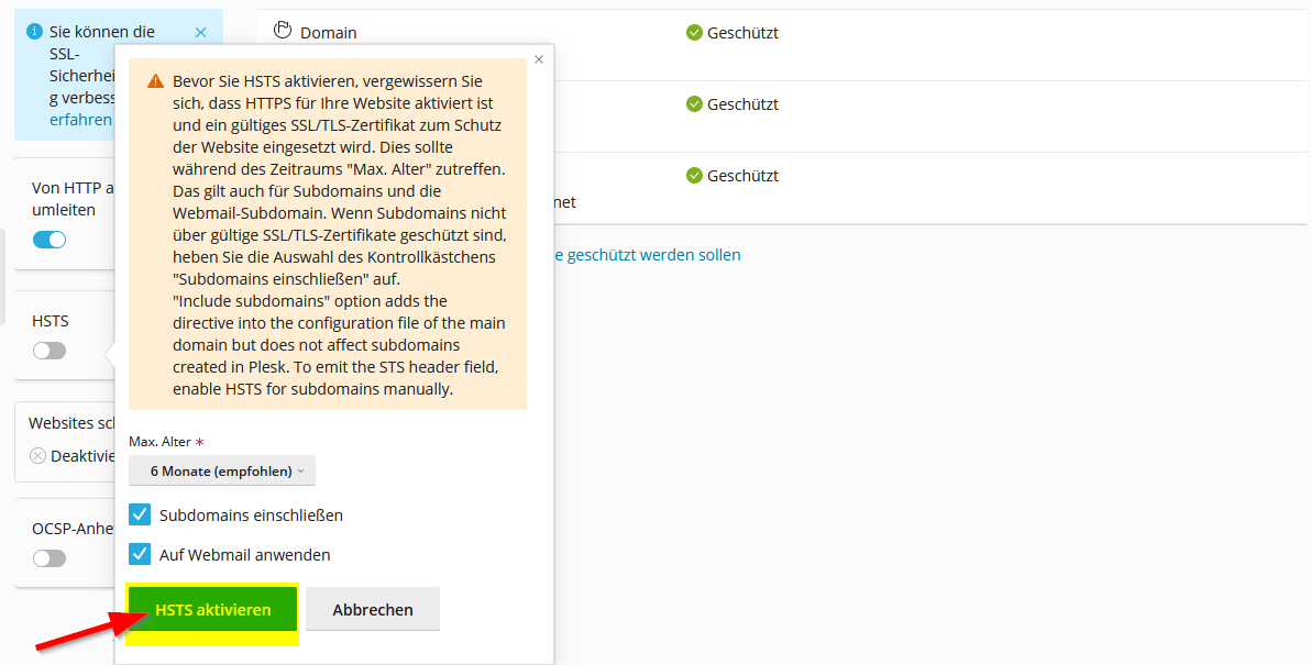 Der Artikel beschreibt, wie man HTTP-Anfragen auf HTTPS umleitet und HSTS aktiviert. In Plesk wählt man die Hosting-Einstellungen und setzt einen Haken für die 301-Weiterleitung von HTTP zu HTTPS. Für HSTS wählt man im Menü SSL/TLS-Zertifikat die Option "HSTS aktivieren" aus. Dies erhöht die Sicherheit der Website durch erzwungene Nutzung von HTTPS.