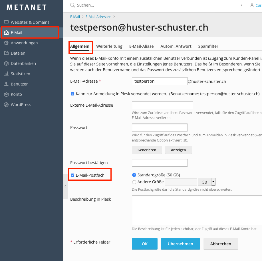 Es ist sinnvoll, eine Mailbox zu deaktivieren, wenn die E-Mail-Adresse nur als Weiterleitung dient und die Mailbox nicht genutzt wird, um Überfüllung und das Überschreiten des Speicherlimits zu vermeiden. Um dies zu tun, loggen Sie sich ins Plesk Administrationstool ein, wählen Sie die E-Mail-Adresse aus und entfernen Sie den Haken bei "E-Mail-Postfach".