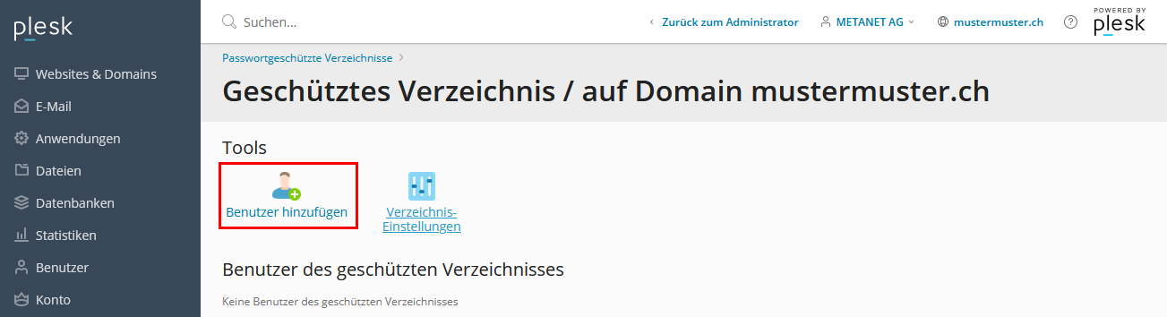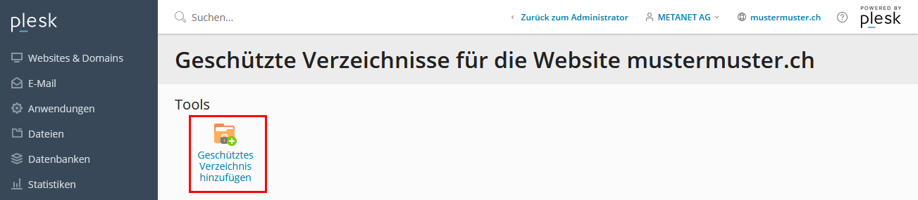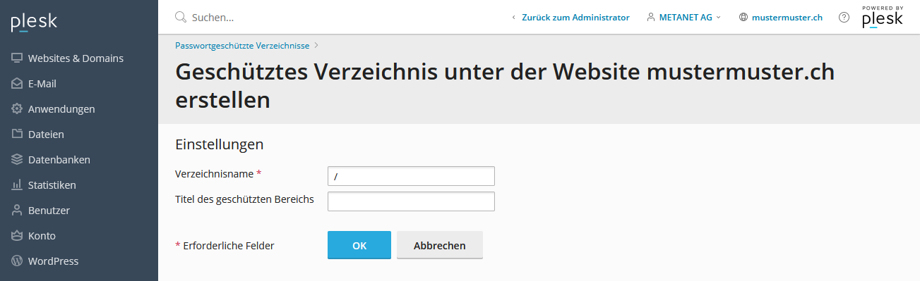 Bei Verzeichnisname den Namen des Verzeichnisses angeben, falls dieses noch nicht existiert, wird es automatisch erstellt. Mit / kann die vollständige Domain geschützt werden.