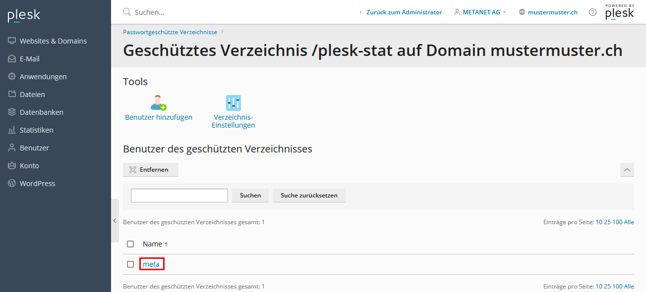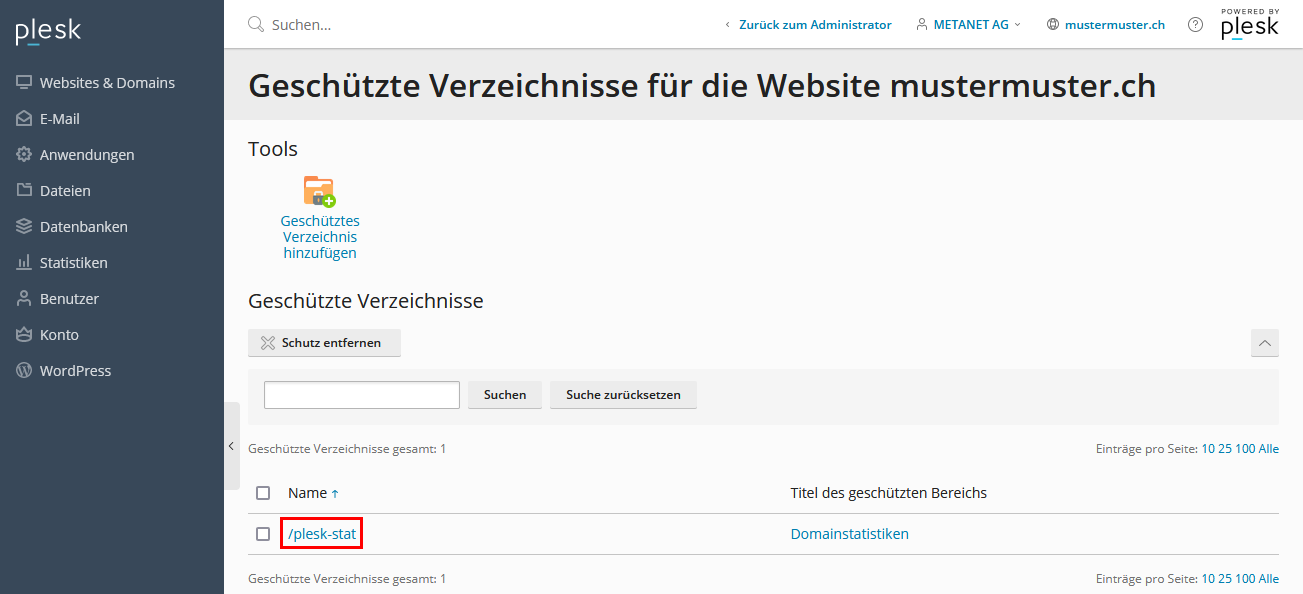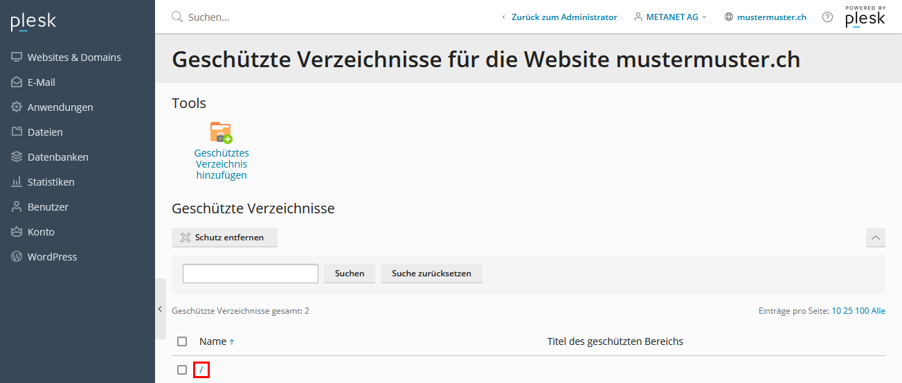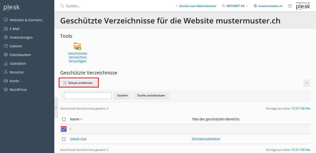 Um den Schutz komplett zu löschen, wählen Sie den Ordnerpfad mit der Checkbox aus und klicken anschliessend auf Entfernen.