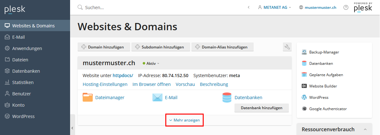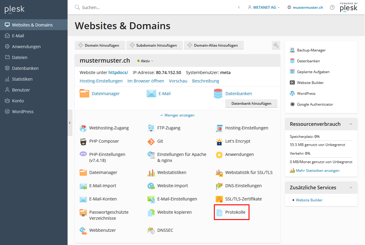 Die Log-Dateien sind über die erweiterten Optionen der jeweiligen Domain zugänglich.
