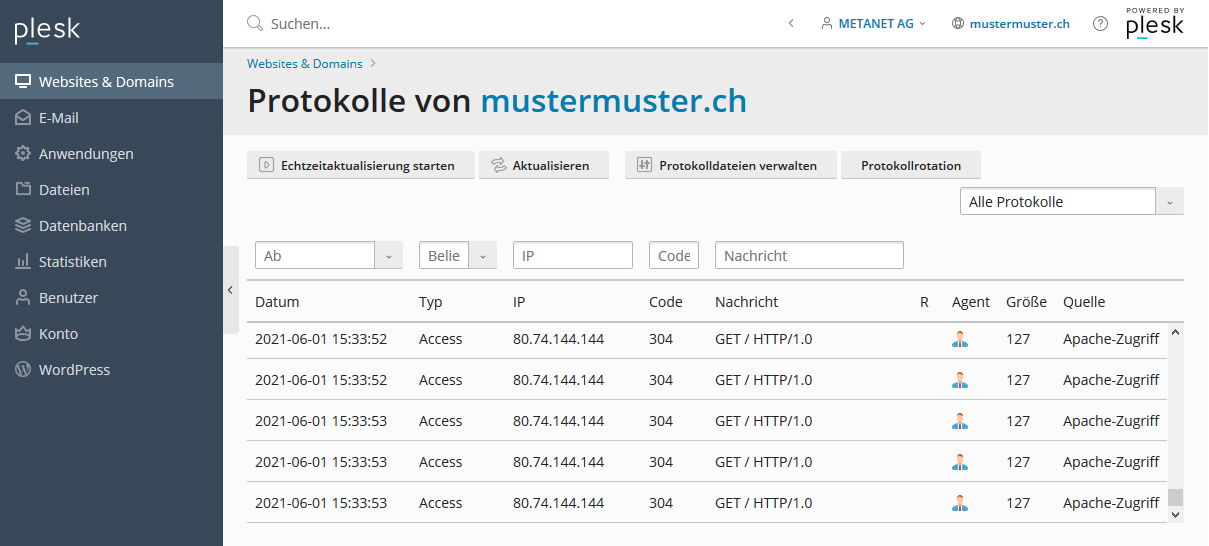 Sie sehen nun eine Übersicht mit den Informationen aus dem Access Log und dem Error Log.