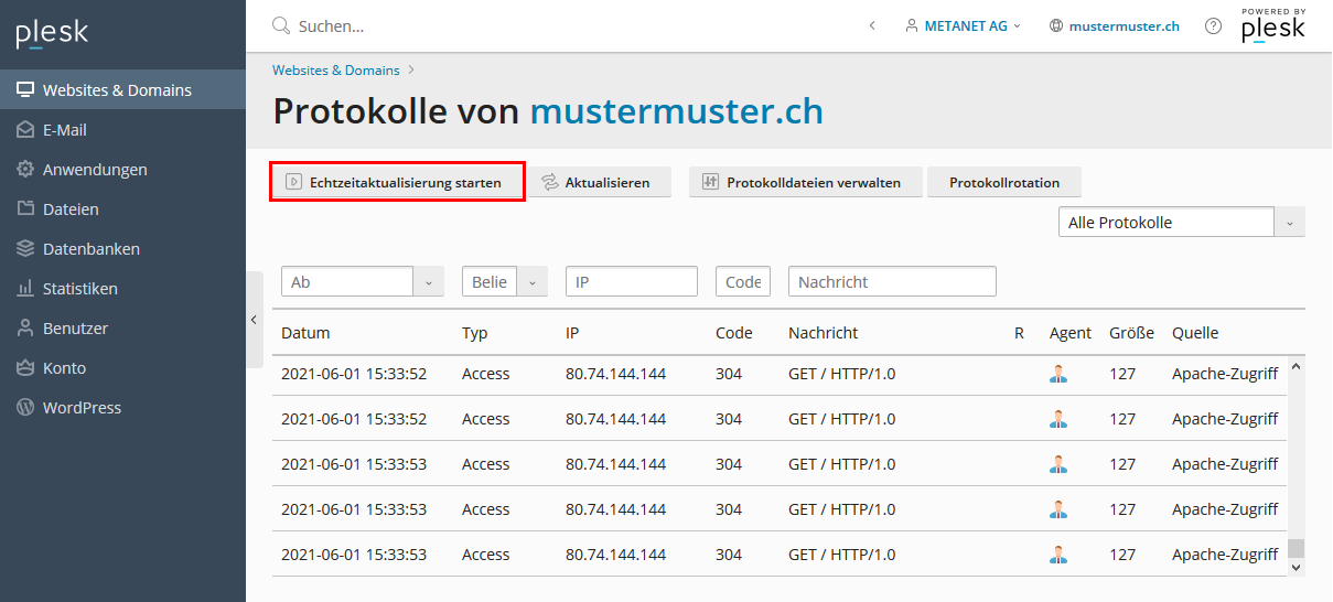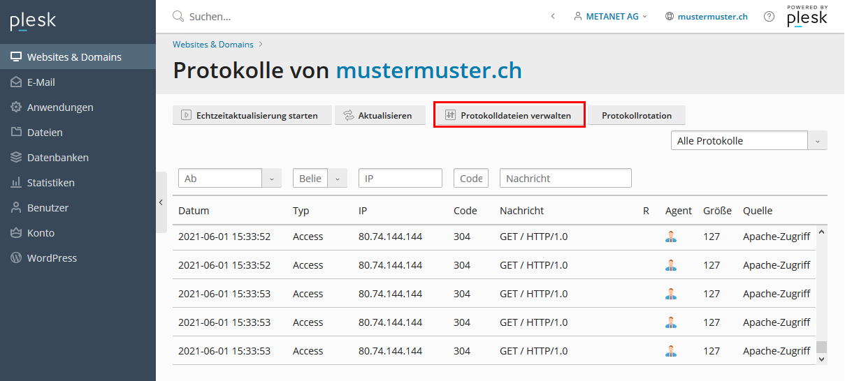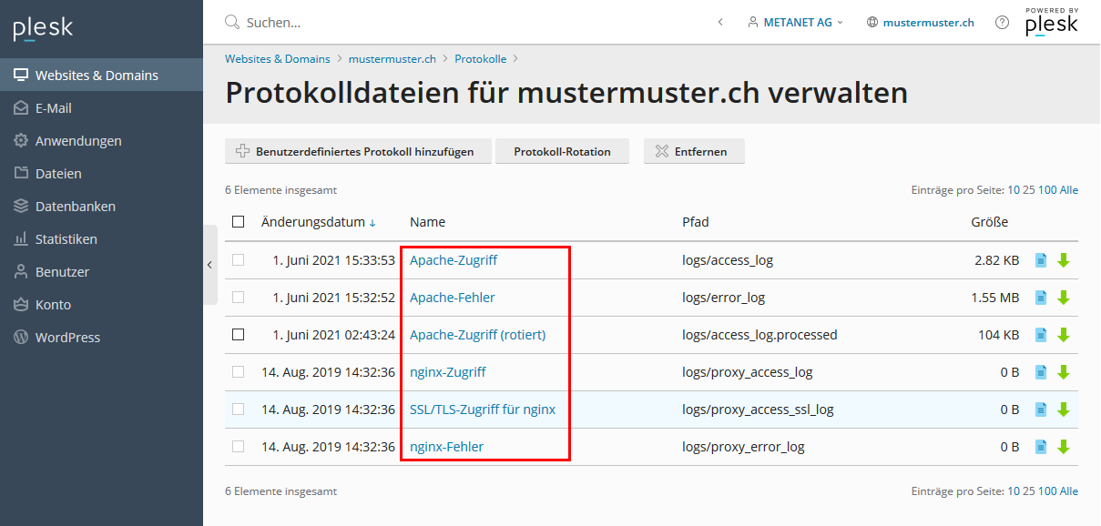 Die Logeinträge können nun direkt über Plesk eingesehen werden oder heruntergeladen werden (grüner Pfeil).