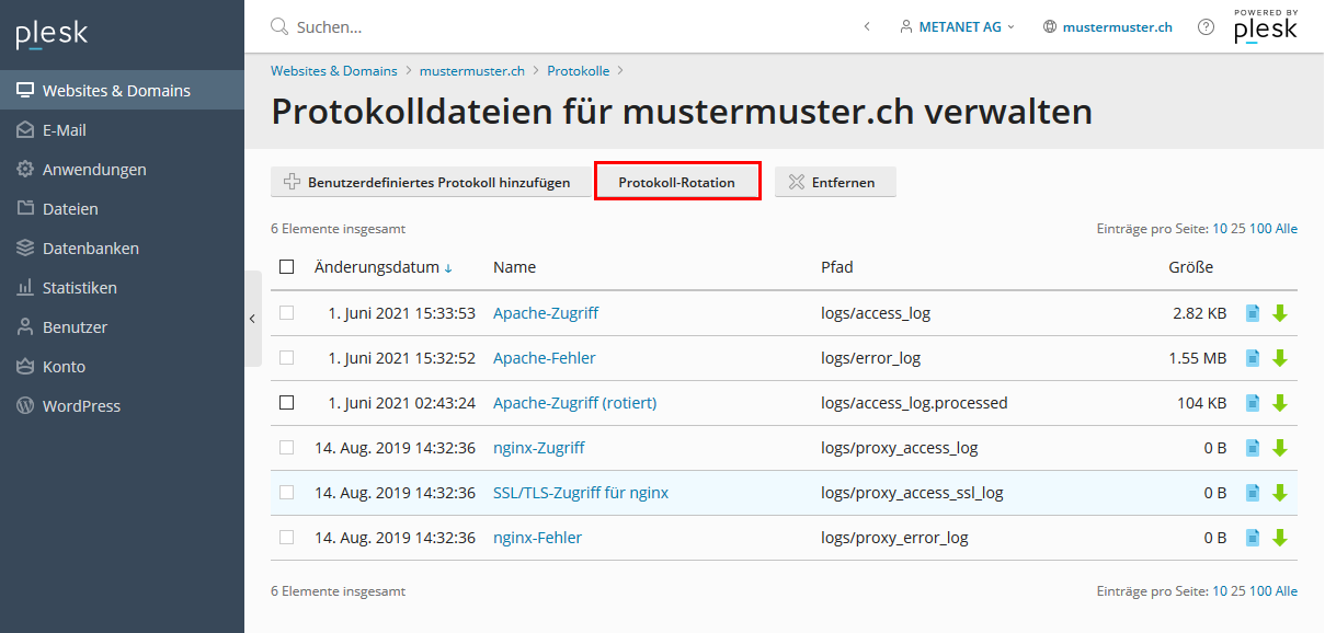 Da auch diese Protokolldaten zum verbrauchten Speicherplatz eines Accounts bzw. einer Domain gehören, ist es auf jeden Fall empfehlenswert, die Rotation sprich regelmässige Löschung der Log-Dateien zu aktivieren. Dazu wählen Sie bitte die Option Protokoll-Rotation: