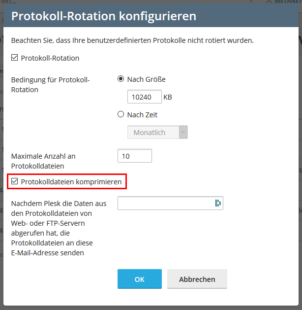 Mit dem Knopf “Protokoll-Rotation” bestimmen Sie, ob alte Logfiles überhaupt gelöscht werden sollen oder nicht. Da auch diese Daten zum verbrauchten Speicherplatz eines Accounts bzw. einer Domain gehören, ist es auf jeden Fall empfehlenswert, die Rotation sprich regelmässige Löschung der Log-Dateien zu aktivieren. Zusätzlich können die Protokolldateien komprimiert und in Ihrer Anzahl eingeschränkt werden womit zusätzlich Speicherplatz gespart werden kann (Option Protokolldateien komprimieren sowie Maximale Anzahl an Protokolldateien).