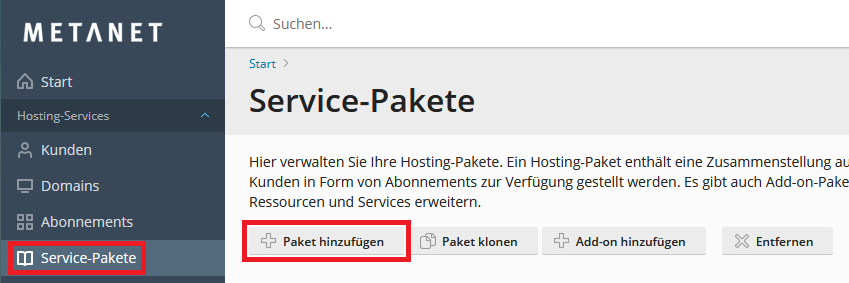 Ein neues Servicepaket erstellen Sie, indem Sie unter "Service-Pakete" auf dem Button "Neues Service-Paket hinzufügen" klicken: