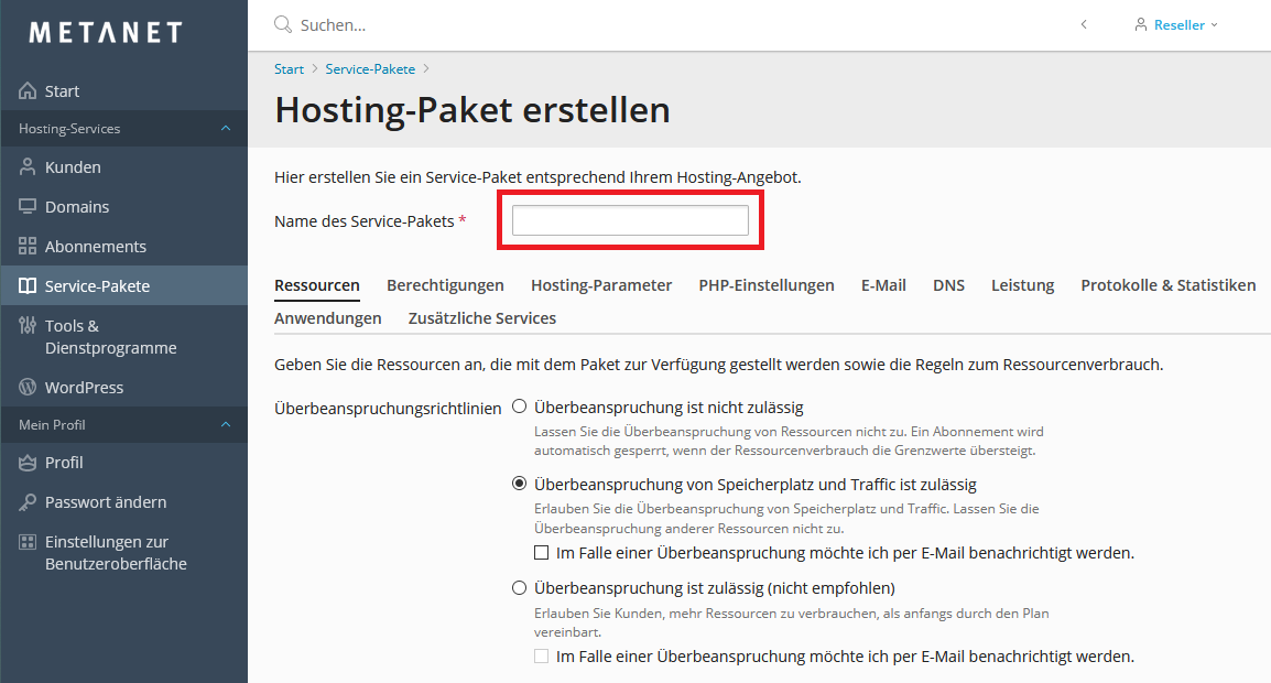 Als Reseller können Sie einzelne Servicepakete definieren und jeweils einem Kunden/Abonnement zuweisen.