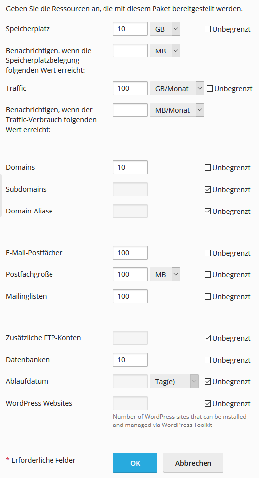 Hier können Sie wählen ob der Kunde den vorgegebenen Speicherplatz überschreiten darf oder nicht. Wählen Sie zudem ob Sie darüber benachrichtigt werden möchten. Weiter unten können Sie die Mailboxgrösse, Anzahl erlaubter Mailadressen/Mailboxen, FTP-Benutzer, Domains, Subdomains etc. begrenzen und festlegen.